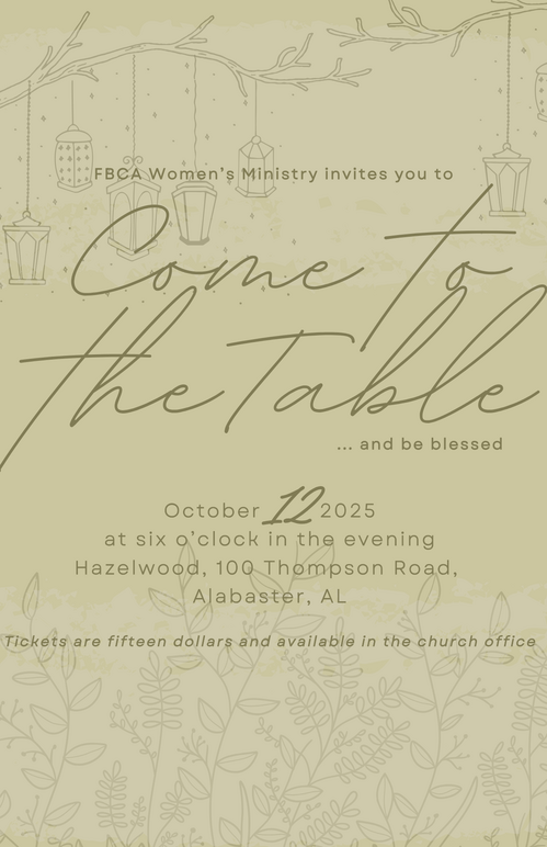 Join us at Hazelwood on October 12th as we dine under the stars. The Ladies of FBC Alabaster invite you to "Come to the Table" and enjoy this unique dinner and fellowship together.
