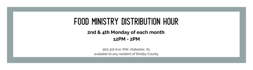 FOOD MINISTRY We are now offering a drive through food ministry on the 2nd & 4th Monday of each month from 12PM - 2PM at 903 3rd Ave. NW, Alabaster for any resident of Shelby County. We offer food assistance to persons who qualify and live in the Zip Code areas 35007, 35114, 35080 and 35124. Those in the Alabaster area with Zip Code 35115 may apply. The first time you come, you must bring proof of residency. We also offer free diapers.