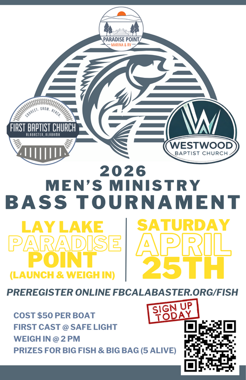 We are excited to announce our Men's Bass Tournament this spring on Lay Lake. We will launch and weigh in at Paradise Point. Use the two buttons below to sign up and pay your boat registration.